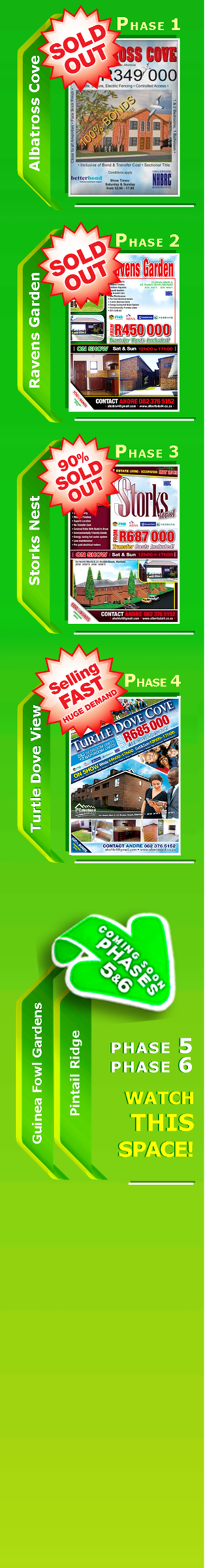 Recently completed & sold out phases Click below to see stunning photos of complete units in respective phases, Phase 1: Albatross Cove Completed - SOLD OUT Phase 2: Ravens Garden Completed - SOLD OUT Phase 3: Storks Nest Completed - 95% SOLD OUT